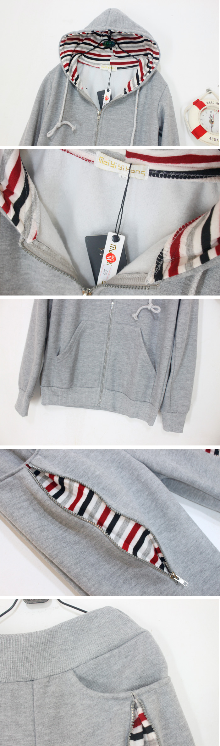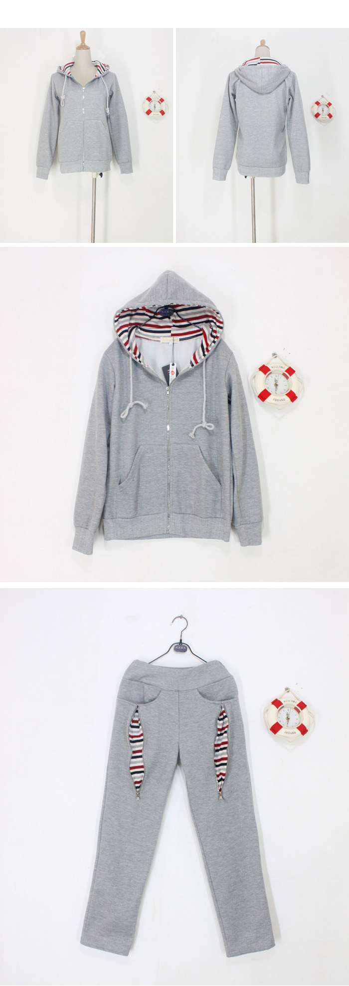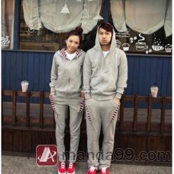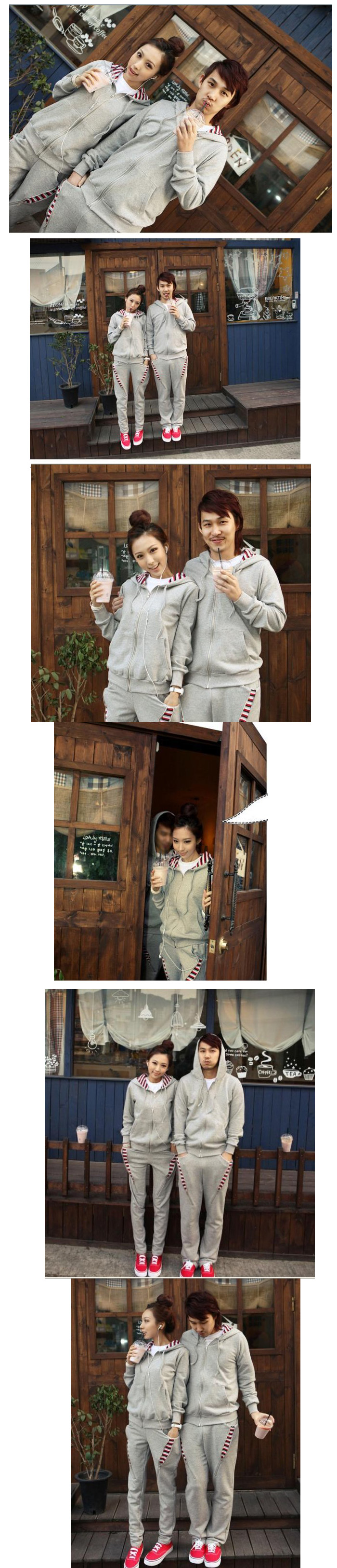 Amanda99 Leisure and Concise Zipper Stripes Grey Long Sleeves Fleeces Hood Couple Suits |