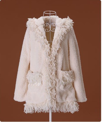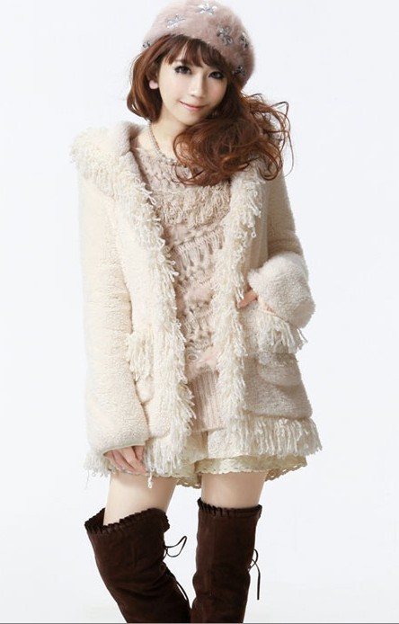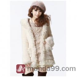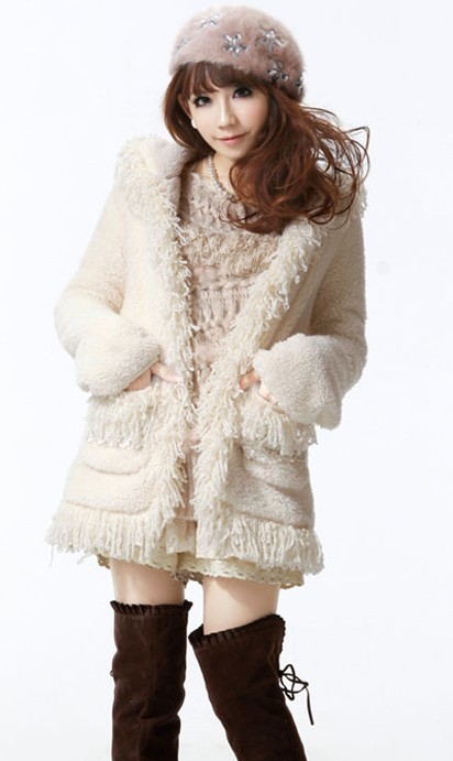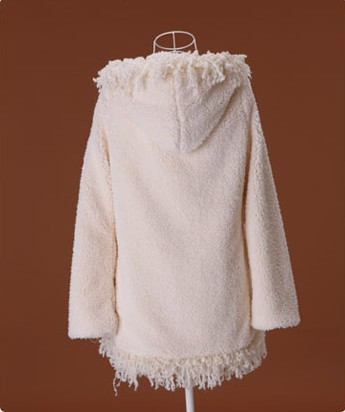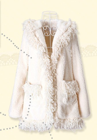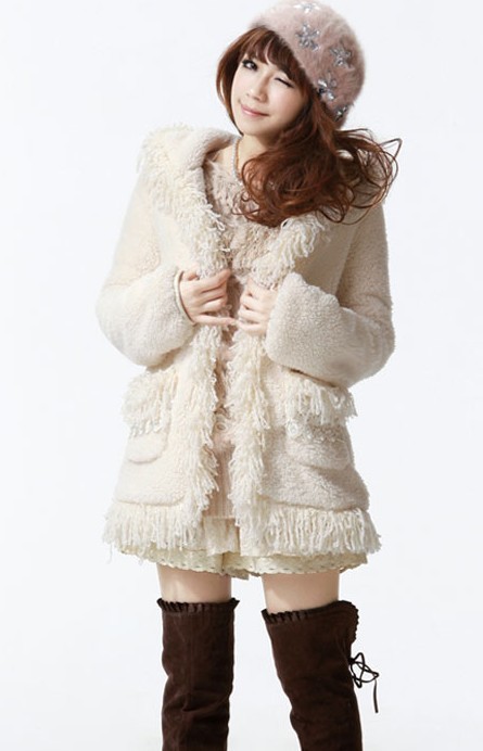 Amanda99 Mix Match Rough Selvedge Tassel Hem Double Pockets Beige Long Sleeves Fleeces Coat For Women |