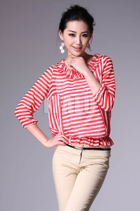 Women Frills Elstic Collar Srtipe Bracelet Sleeve Georgette Silk Tops |