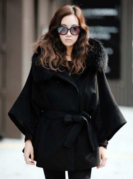 Women Fox Fur Collar Belted Wool Coat Trench long Coat |